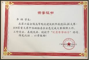 在校期间我更早的关注了创新实践能力的发展,其中最激励我的就是参加过两年的BIM大赛,我从一个参赛者变成了一个组织者、领导者、协调者。2017、2018年参加和带领30余人参加BIM算量大赛,设计训练项目、组织安排学习、检验进度效果被授予“优秀组织者”称号。比赛期间帮助广联达公司组委会完成大赛保障工作被授予“优秀赛事助手”称号。每次工作和学习之困难都超越想象,但坚持下来却收获满满。最后我带领团队获得全国二等奖、三等奖。同时在考取证书率仅为百分之十的情况下,有一位队员和我一起考下了BIM土建、钢筋算量一级认证证书,为我以后从事土建信息化工作提供了一把金钥匙。此外在建模领域,我先后参加过亚太地区大学生数学建模竞赛、全国大学生数学建模竞赛、黑龙江省绿建比赛,均取得优异成绩。2018年5月我主持了一项校级大创并发表过两篇论文,“要么不做,要么做好”这样的信念一直贯穿着我所有的参赛时光。