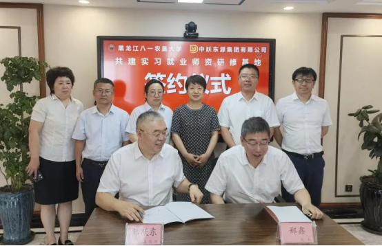 院长郑鑫与尼尔基公司人事处处长周丽签订院企工程实践教学协议,尼尔基公司总经理王海军与学院党委书记王天亮共同为“实践教学基地”揭牌。